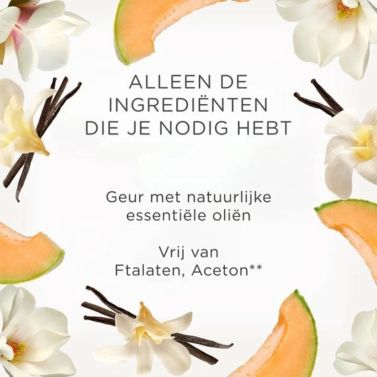 - Geeft continu en langdurig geur van frisse witte bloemen, zoete meloen en subtiele vanille af.