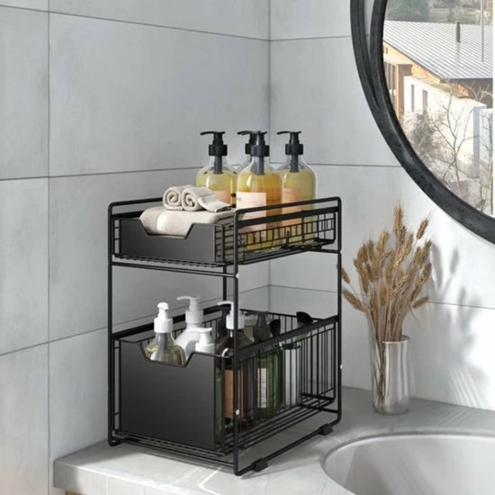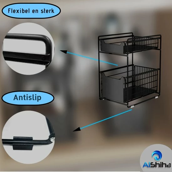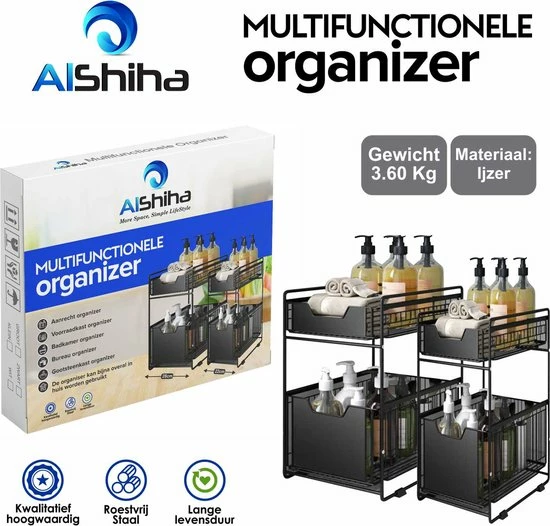 Maak uw aanrecht, badkamer of werkplek overzichtelijker met de AlShiha Organizer. Hiermee geeft u uw voorraadpotten, schoonmaakmiddelen en kantoorbenodigdheden een logische opbergplaats. Het ijzeren opbergsysteem van AlShiha steunt op antislipvoetjes en beschikt over twee ruime, uitschuifbare lades. Zo kunt u snel en gemakkelijk uw spullen pakken en geniet u van een opgeruimd vertrek als u de spullen niet nodig hebt.