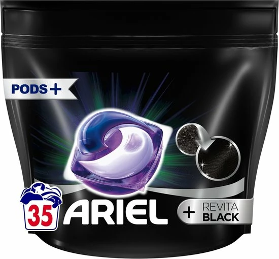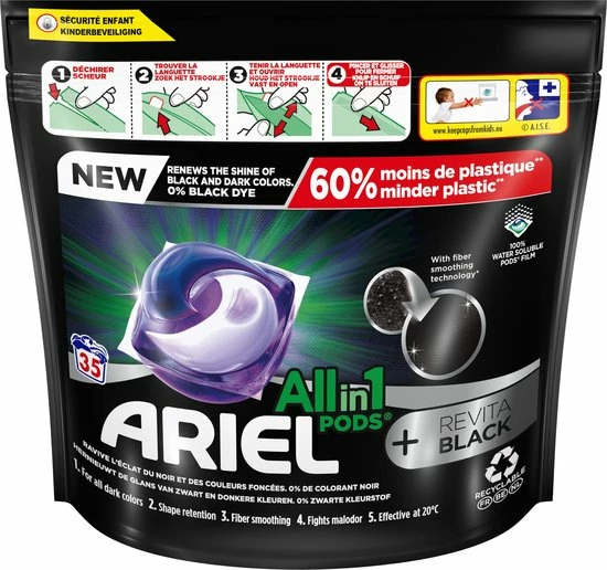 Ariel All-in-1 Pods wastabletten wasmiddel +Revitablack hernieuwt de glans van zwarte en donkere kleuren. Ze bieden uitzonderlijke reiniging in een kleine wasmiddelcapsule 1. Verwijderen vlekken 2. Hygiënische reiniging 3. Verfrissen 4. Stralend in een koudere was 5. 100% in water oplosbaar laagje + vezelvernieuwingstechnologie. Ariel wastabletten hebben een smart multi-ontwerp met meerdere compartimenten die de ingrediënten gescheiden houden tot ze de was bereiken. Bij contact met water lost het laagje op om krachtige vlekverwijderende technologieën vrij te geven en Ariels diepste en sterkste reiniging van All-in-1 Pods +Revitablack ooit te bieden. Daarnaast worden de Ariel All-in-1 Pods wasmiddelcapsules geleverd in een recyclebare verpakking. Let op: Dit product kan schadelijk zijn en ernstige verwondingen veroorzaken. Ariel All-in-1 Pods altijd buiten het bereik van kinderen houden. Bezoek keepcapsfromkids.eu voor meer informatie.