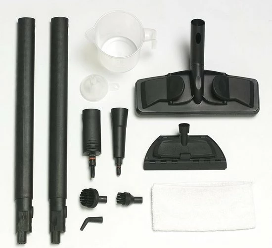 - Inclusief multifunctioneel accessoirepakket: vloerborstel, 2 verlengbuizen, vloerdoek, stoompistool, gebogen spuitmond, 1 kleine ronde borstel, 1 grote ronde borstel, 2-in-1 gecombineerde raamwisser, maatbeker en vultrechter