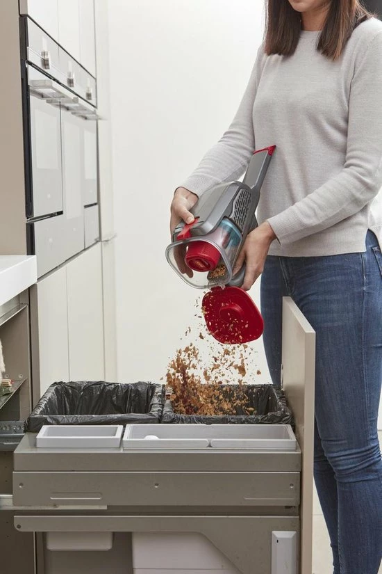 Door zijn geïntegreerde uitschuifbare kierenzuiger heb je een veel groter bereik op hoogte en in krappe ruimtes. De 700ml opvangbak leeg maken is nog nooit zo eenvoudig geweest. Met één druk op de knop opent de bodem van de opvangbak en kan je het vuil weggooien zonder dat dit in contact komt met je handen. De filters zijn gemakkelijk en hygiënisch schoon te maken. Doe dit regelmatig om de prestaties optimaal te houden.