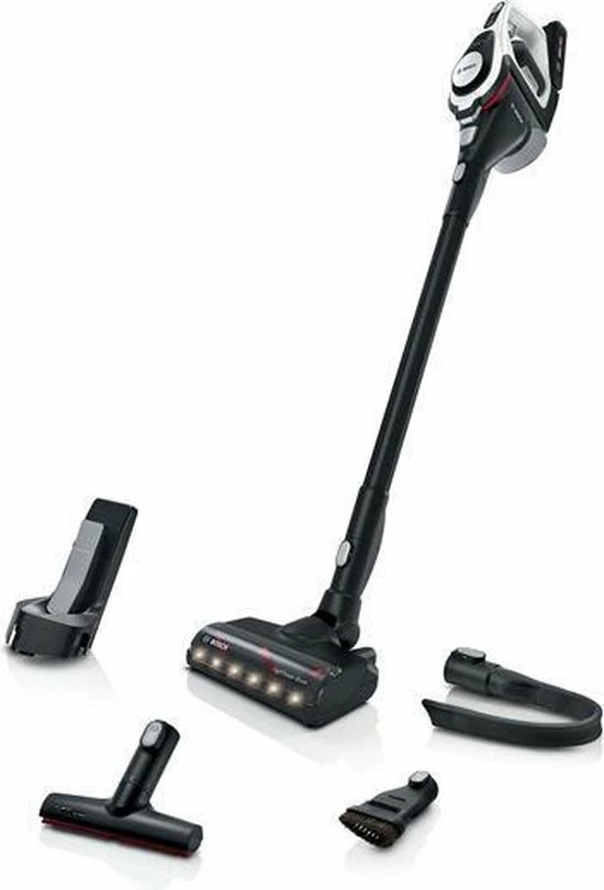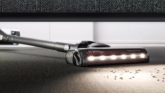 De Bosch Unlimited 8 BBS8214 steelstofzuiger is dankzij de 18 volt Power for ALL System-accu geschikt voor efficiënt en langdurig stofzuigen. De Bosch Unlimited 8 BBS8214 steelstofzuiger is voorzien van drie zuigstanden, inclusief een ECO- en turbostand, en komt met een AllFloor HighPower-borstel met geïntegreerde LED-verlichting. Met de geïntegreerde LED-verlichting in de 180 graden roterende borstel, kun je tijdens het zuigen goed inzicht krijgen op welke plekken in huis er nog vuil ligt. Daarbij kun je tot onder meubels volledig stofzuigen omdat de steelstofzuiger kan roteren, zodat je de verste hoeken kan bereiken. Handmatig wisselen tussen vloerbedekking of houten vloer is niet meer nodig. Met de automatische vloerdetectie past de stofzuiger de zuigkracht automatisch aan per type ondergrond. De Bosch Unlimited 8 BSS8214 steelstofzuiger zorgt ervoor dat iedere meter van jouw huis weer stofvrij wordt. Deze Bosch steelstofzuiger is voorzien van een hygiënefilter die tot 99,99 % de lucht zuivert.