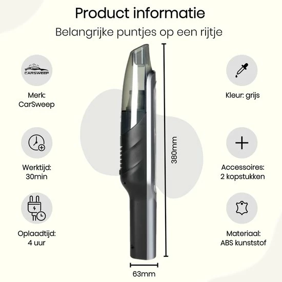 We kennen het allemaal wel uw kinderen of andere gasten nemen plaats in uw auto en laten een enorme rommel achter. Of misschien heeft u zelf gegeten in de auto en is uw auto hierdoor niet meer zo schoon als u hem wilt hebben. Kruimels, stof en zand hopen zich gemakkelijk op in uw auto. De CarSweep autostofzuiger gaat hiermee de strijd aan!