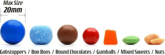 De Gumball Machine kan eenvoudig worden aangepast om met snoep van verschillende grootte te werken, de maximale grootte kan worden ingesteld op 20 mm breed.