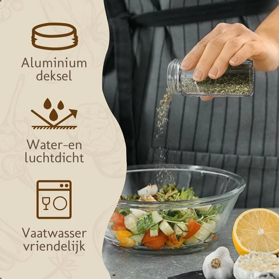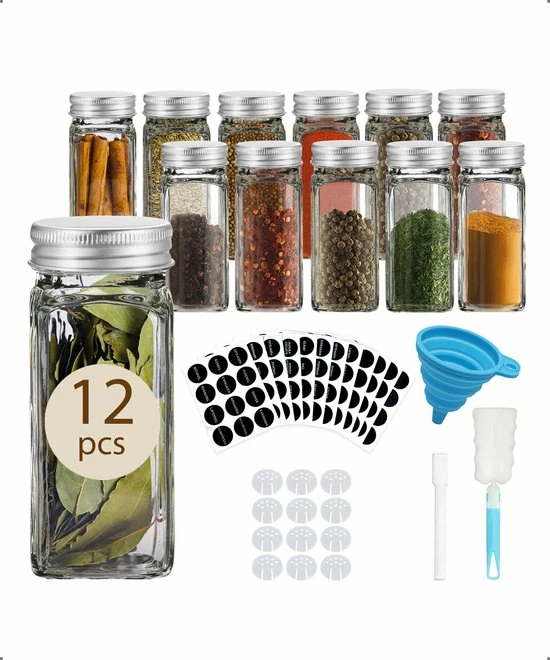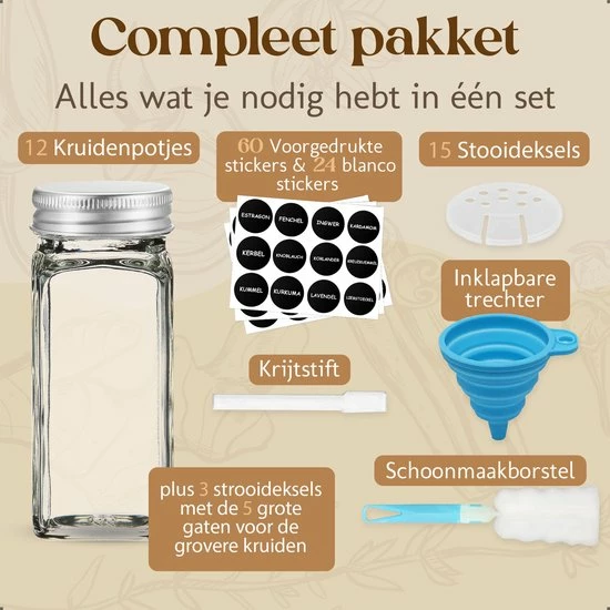 De kruidenpotjes set van Comforder bevat alles wat je nodig hebt. Naast de 24 kruidenpotjes met multifunctionele strooideksel en metalen draaideksel ontvang je ook nog een inklapbare trechter, 60 voorgedrukte stickers, 24 blanco stickers en een krijtstift voor deze stickers. Zo kun je de potjes gemakkelijk vullen met jouw kruiden en staat alles mooi en overzichtelijk in jouw kast of kruidenrek.