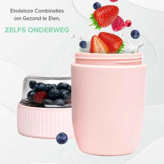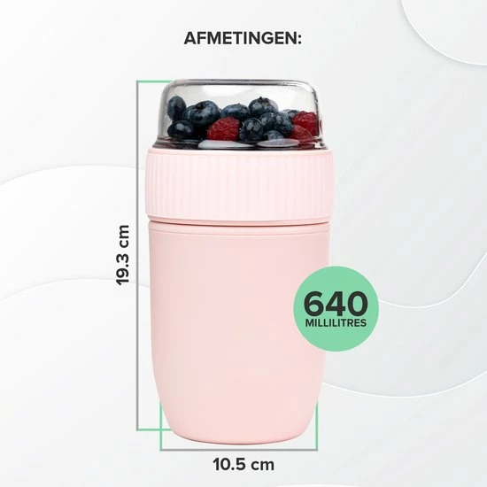 Een lunchpot is perfect voor het bewaren en meenemen van een gezond ontbijt of gezonde lunch. De beker is naast yoghurt en muesli ook ideaal om andere dranken, groenten en fruit in te bewaren. De containers zijn opgedeeld in 450 milliliter en 190 milliliter. De twee delen van de beker zorgen ervoor dat de ingrediënten elkaar niet aanraken, zodat ze vers blijven. Dit is handig voor een lange werkdag of wanneer je de hele dag onderweg bent. De beker heeft een smal design en een siliconen band voor extra grip.