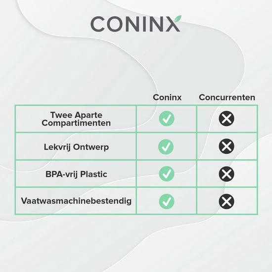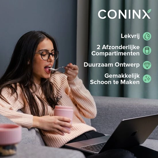 De Coninx yoghurtbeker heeft een volledig lekvrij ontwerp. Hierdoor stop je de lunchpot zorgeloos in je tas, zonder dat jij je zorgen hoeft te maken over het lekken van yoghurt of andere dranken. De beide containers in de lunchbeker beschikken over een stevige schroefdop. Haal de onderdelen eenvoudig om ze in de vaatwasser te stoppen. Zo is de lunchpot makkelijk en snel weer klaar voor een volgend gebruik.
