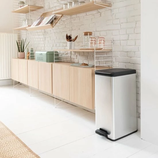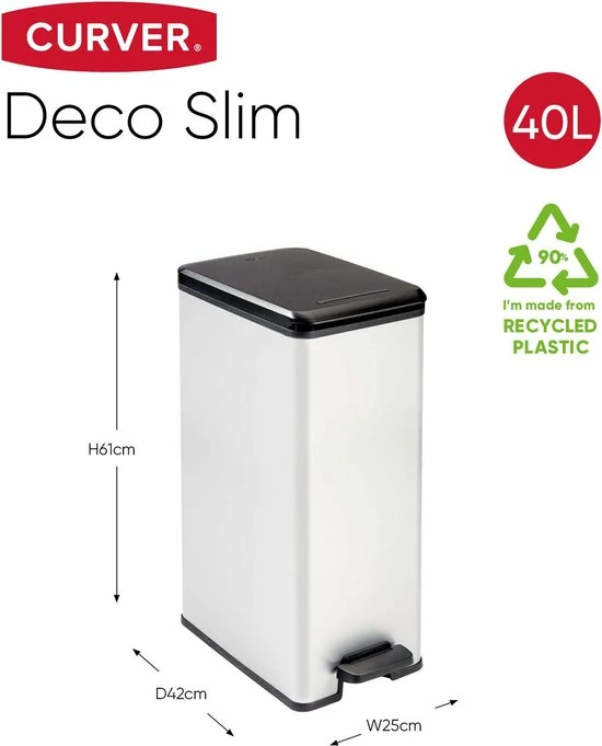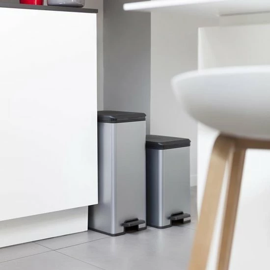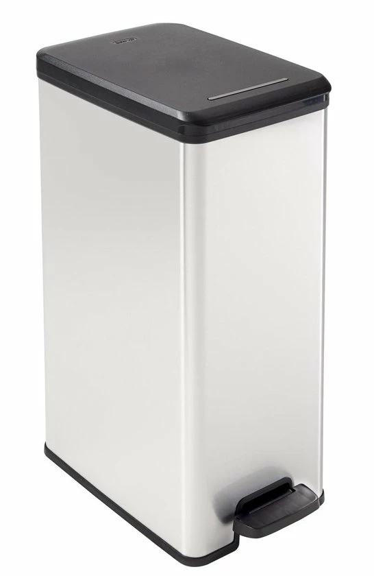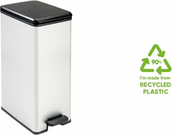 De Curver Decobin Afvalbak – Rechthoekig – 40L heeft de uitstraling van metaal en de voordelen van kunststof waardoor hij niet roest, niet deukt, licht is van gewicht, eenvoudig te reinigen en vingerafdrukken niet zichtbaar zijn. Deze vuilbak is voorzien van een breed en comfortabel pedaal en een flexibele rand in het deksel waardoor nare geurtjes niet kunnen ontsnappen. Verder heeft het deksel een soft-close mechanisme waardoor het geruisloos sluit. De bak heeft ook een anti-vacuumsysteem waardoor het eenvoudiger wordt om de zak te verwijderen en de vuilniszak wordt op zijn plaats gehouden door twee beugels. Door deze beugels is de vuilniszak van buitenaf niet zichtbaar. Daarnaast is deze afvalbak ook een duurzame oplossing doordat hij is gemaakt van 90% gerecycled kunststof. Kortom een product dat onmisbaar is in jouw huishouden.