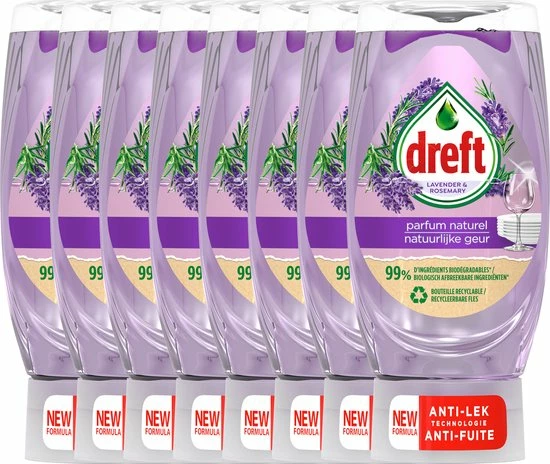 Dreft Dreft Naturals-afwasmiddel biedt je de originele reinigingskracht van Dreft voor je vaat en een 100% natuurlijke geur van lavendel uit de Provence en rozemarijn. Het bevat 99% biologisch afbreekbare ingrediënten (water en niet-organische zouten uitgezonderd) en komt uit in een eenvoudige ondersteboven fles, voor een snelle en eenvoudige reiniging.