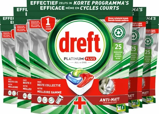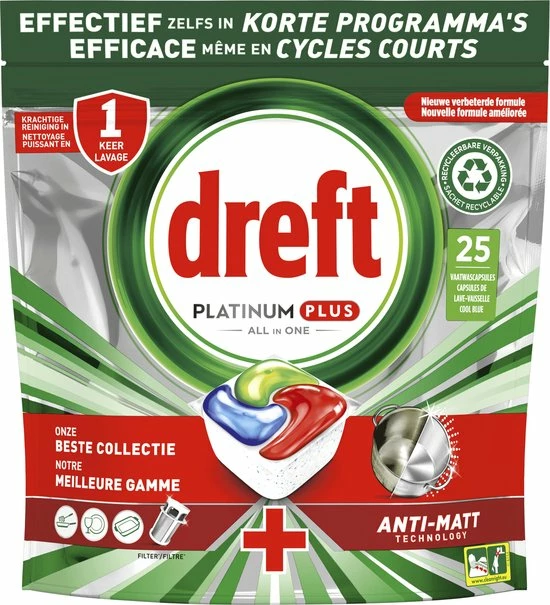 Dreft Platinum Plus All in One vaatwascapsules zorgen voor een reiniging als nieuw, het geeft je Dreft’s beste collectie voor het reinigen van hardnekkig voedsel en het helpt zelfs de dofheid weg te nemen die in de loop van de tijd is opgebouwd, om de oorspronkelijke glans van je vaatwerk te herstellen. Dreft Platinum Plus geeft je een uitmuntende reiniging en verwijdert hardnekkige voedselvlekken, zelfs in de testconditie van een korte cyclus. Dus, als je weinig tijd hebt, is er niets aan de hand. Schakel over op kort. Dreft combineert vloeistof en poeder in één krachtige capsule. Het ultra-oplosbare zakje lost snel op en werkt goed in korte cycli omdat het snel begint te reinigen om de klus klaar te krijgen. En ze zijn gemakkelijk te gebruiken. Plaats ze gewoon in het doseerbakje van je vaatwasser, met verpakking. Schakel over op de korte cyclus* en bespaar tijd, energie en water in vergelijking met een gewone, standaard cyclus!