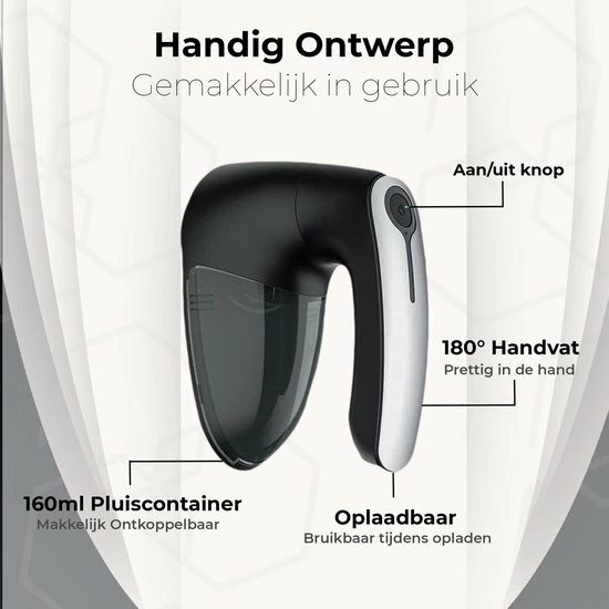 Geef de pluizen op uw kleding of meubilair de schrik van hun leven met de pluizenverwijderaar van Ekesa. Dit is veruit de meest gebruiksvriendelijke en effectieve pluizenverwijderaar die u op bol.com gaat tegenkomen! Geen batterijen, geen vervelend snoer maar een milieuvriendelijke accu die u 60 minuten lang kunt gebruiken. De pluizen worden opgevangen in de pluizen verzameldoos, zodat u het alleen nog maar hoeft weg te gooien.