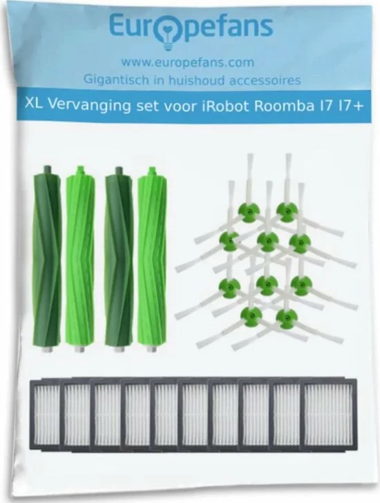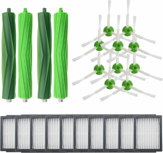 Deze set van 24 stuks bestaat uit 10 zijborstels (iRobot 4624877), 4 hoofd borstels (klopborstel en veegborstel iRobot 4624870) en 10 stof filters. Vervangt de originele iRobot nummers 4624878 en 4639168.