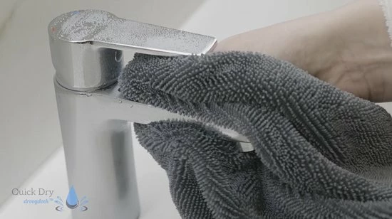 Onze Quick Dry droogdroek™ heeft een uitstekende absorberende werking en kan tot wel 700ml water opnemen zonder te gaan druppelen. Het speciale ontwerp zorgt er voor dat jouw badkamer binnen no-time droog is en voorkomt dat er kalk achter blijft op de tegels, voegen en kit. Dit zorgt er uiteraard voor dat de badkamer als nieuw blijft en jaren langer mee gaat! En dat is nog niet alles… De doek zorgt er ook nog eens voor dat e.e.a. vlek en streepvrij opdroogt. Tussendoor is de doek makkelijk uit te wringen en direct weer te gebruiken. De doek is tevens te gebruiken voor het drogen van de glaswand en het sanitair, zoals de kranen, waardoor ook deze zullen glimmen en vrij blijven van strepen, vegen en natuurlijk het belangrijkste kalkaanslag!