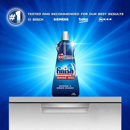 - Meest aanbevolen reinigingsmiddel, op basis van gerenommeerde vaatwasmachine- en glasfabrikanten die Finish aanbevelen.