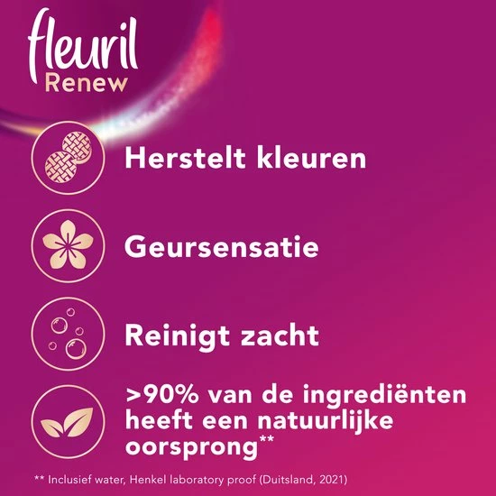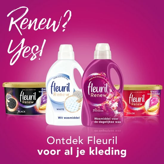 Ontdek Fleuril Renew Bloesem wasmiddel – de ideale verzorging voor gekleurde en witte kleding! Het wasmiddel voor de dagelijkse was reinigt zacht om je kleding zo lang mogelijk mooi te houden. Daarnaast hernieuwt het de kleuren van je kleding was na was en geeft het wasmiddel je kleding een unieke heerlijke geur. Met Fleuril wasmiddel ziet en voelt je kleding geweldig! Fleuril wasmiddel kan gebruikt worden voor zowel koud als heet water en kan ook voor de handwas gebruikt worden.