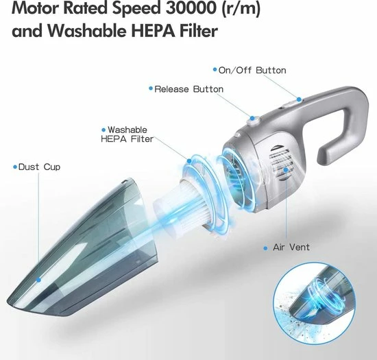 【Geavanceerd filtersysteem】 Deze handstofzuiger heeft een verwijderbaar en wasbaar HEPA-filter, de filtratie- en stofverwijderingseffecten worden aanzienlijk vergroot. Het kan uw auto en huis grondig reinigen. Dit is de beste keuze voor jou.