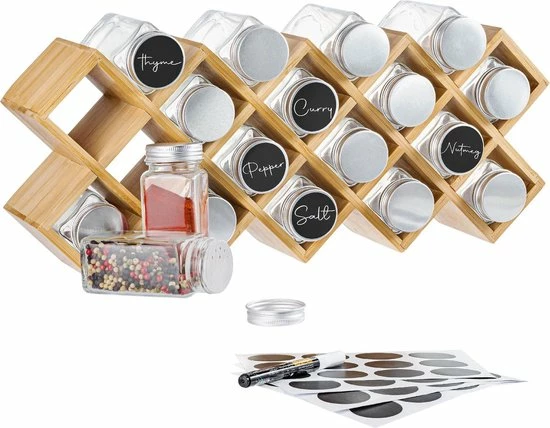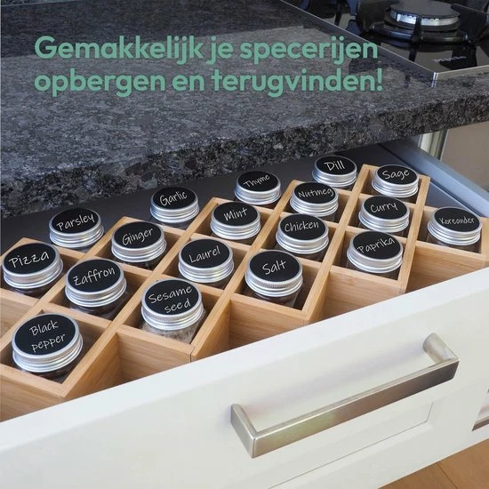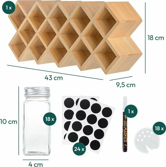 Volledige set – Deze set bestaat uit een bamboe kruidenrek, 18 kruidenpotjes, 24 stickers en 1 witte krijtstift. Geschikt om al jouw kruiden in te bewaren!