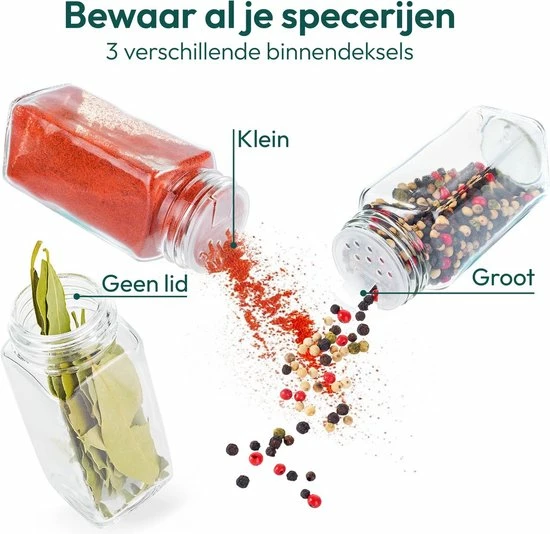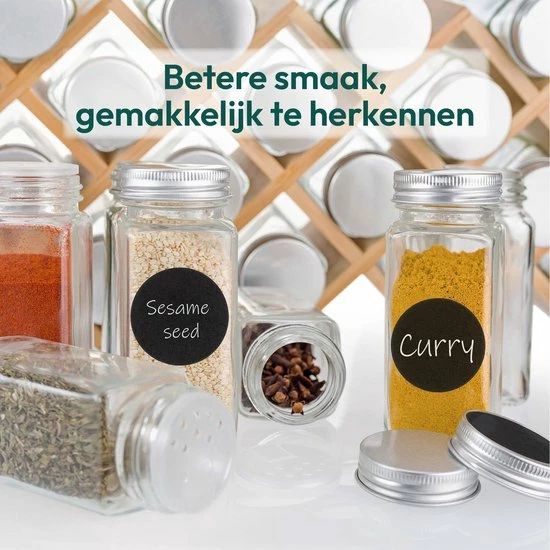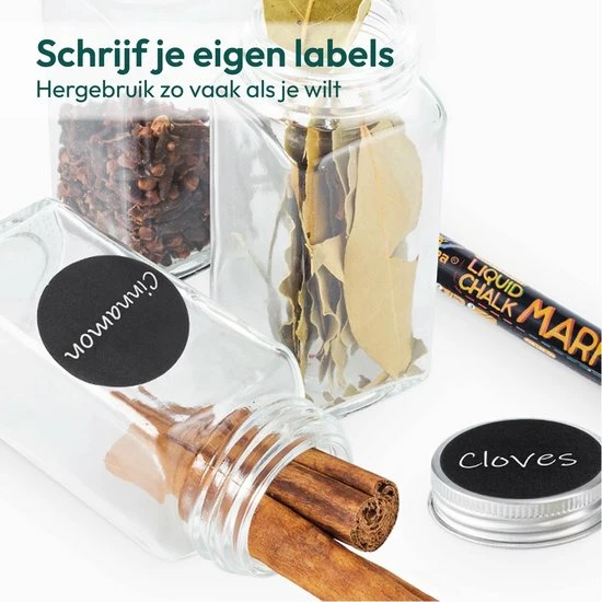 Inclusief labels – Met de krijtstift schrijf je zelf op de stickers welke kruiden er in de strooibus zitten, waardoor je duidelijk en snel ziet welke specerijen je nodig hebt. Wil je later toch iets anders in het potje stoppen? Dan veeg je de stift eenvoudig weg met een vochtige doek.