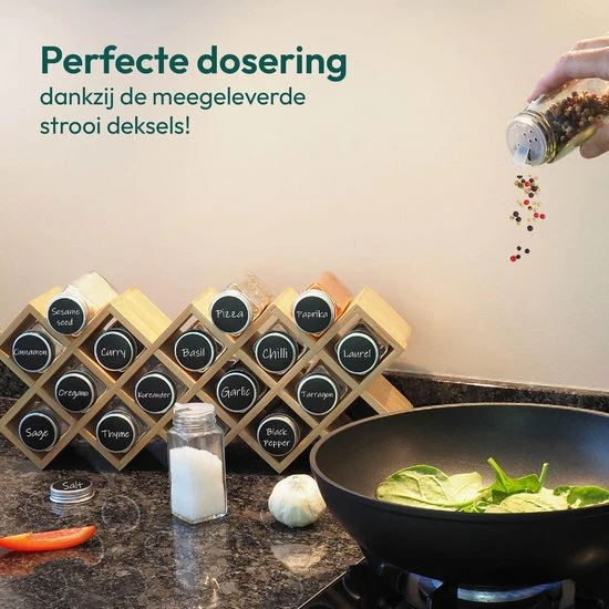 Het Kruidenrek is gemaakt van duurzaam bamboe en de potjes zijn van echt glas en hebben een 2-in-1 strooideksel met een grote en kleine opening en zijn daardoor op meerdere manieren te gebruiken.
