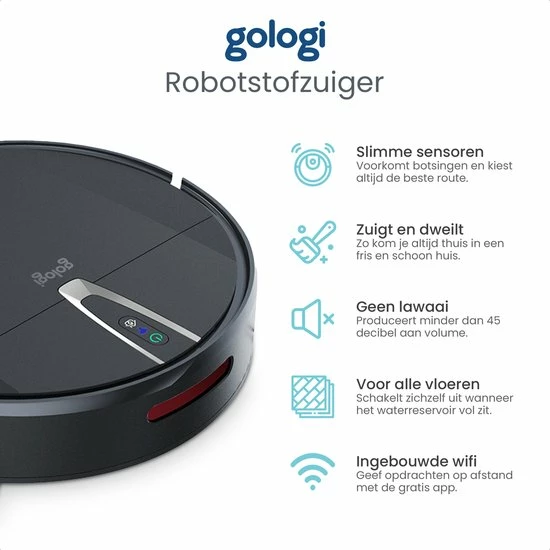 Aan een robotstofzuiger zitten eigenlijk alleen maar voordelen verbonden. De Gologi robotstofzuiger is geschikt voor de meeste vloersoorten, kan 360° graden draaien en zorgt er daarnaast voor dat de vloer zowel gedweild als gestofzuigd wordt. Hierdoor ziet jouw vloer er altijd spik en span uit, ook als je zelf geen tijd hebt gehad om te stofzuigen!