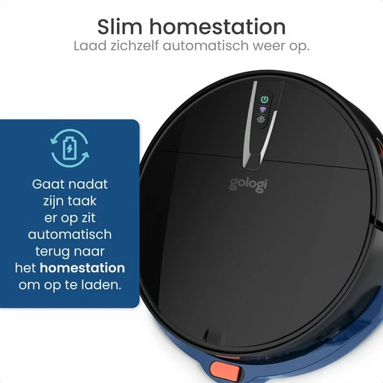 · Krachtige accu – De accu van de Gologi stofzuiger is ontworpen om zeer lang non-stop mee te gaan. De stofzuiger zal na het stofzuigen automatisch naar zijn laadstation gaan om daar weer opgeladen te worden.