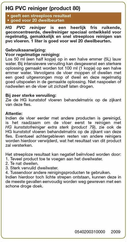 Los 50 ml HG PVC reiniger op in een halve emmer (5L) lauw water. Vervolgens de PVC vloer moppen of dweilen met een goed uitgewrongen mop of dweil en deze regelmatig goed uitspoelen in de gemaakte oplossing van dit schoonmaakmiddel voor de PVC vloer . Niet naspoelen of nadweilen met schoon water en de vloer uit zichzelf laten drogen.