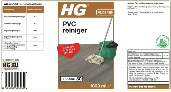 HG PVC reiniger reinigt gemakkelijk en snel PVC-vloeren en geeft een streeploos resultaat. Deze PVC reiniger heeft een frisse geur en is zeer geconcentreerd. 1 liter is goed voor wel 20 dweilbeurten.