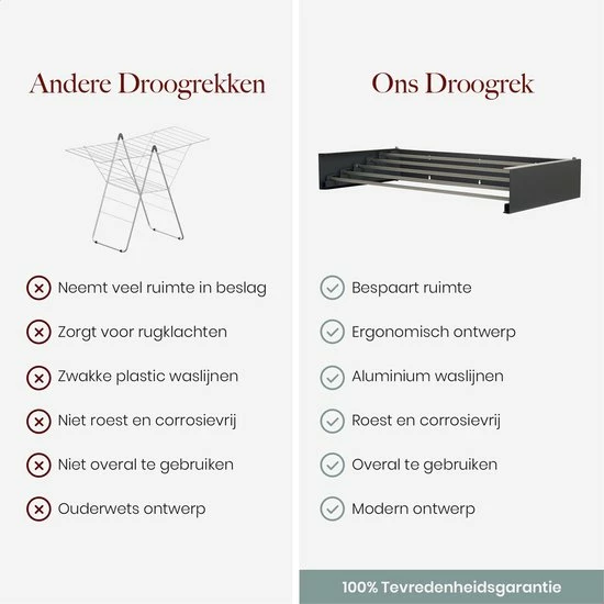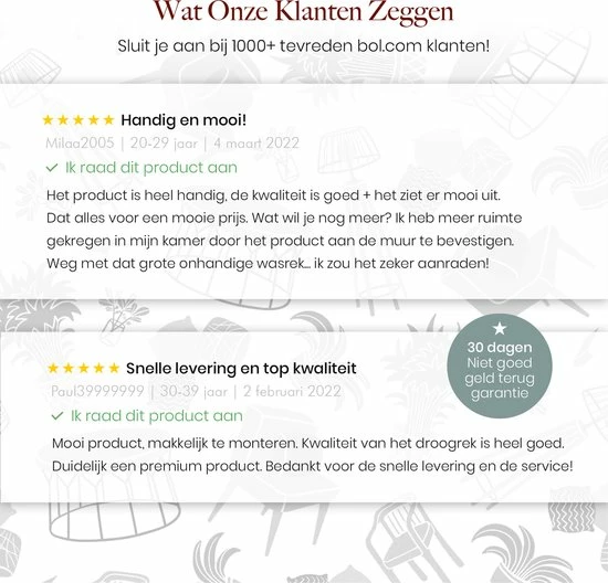 Het Homestic© inklapbaar wanddroogrek is gewaarborgd door onze 100% tevredenheidsgarantie. Als het product niet naar wens is, kun je het binnen 30 dagen gratis retourneren en krijg je gewoon je geld terug.