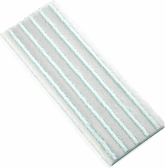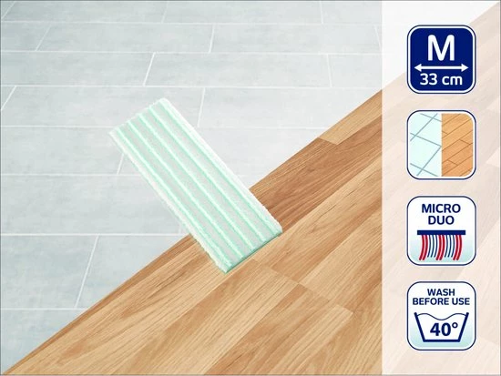 De Leifheit vloerwisserpad micro duo voor de vloerwisser Picobello M. Dubbele schoonmaakpower dankzij zijn 2-vezels-systeem. Deze vloerdoek heeft rijen microvezel borstelhaartjes die iets langer zijn dan de rest. Ze halen het vuil uit alle kieren en werken ook uitstekend bij gestructureerde oppervlakken. De microvezels nemen met hun vele microscopisch kleine tussenruimtes tussen de vezels en met hun grote oppervlak al het vuil en water op. Vloerdoek micro duo is wasbaar op 40°C en behoudt zijn reinigingskracht ook na vele malen wassen. Wisbreedte: 33 cm.