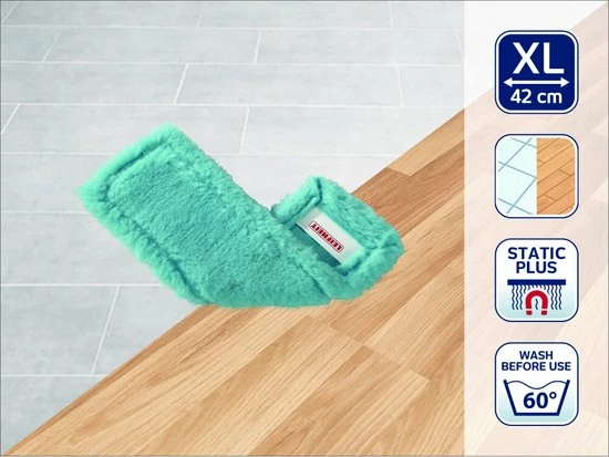 De Profi Static Plus (gevouwen) Overtrek van Leifheit bestaat uit speciale polystervezels en is ideaal voor het droge reinigen van gladde vloeren zoals laminaat en parket. De vezels trekken stof en haren als een magneet aan en laten niet meer los. Hij is wasbaar tot 40°C en verliest ook na herhaaldelijk wassen niet aan reinigingskracht. Past perfect op de vloerwisser Profi (42 cm) van Leifheit.