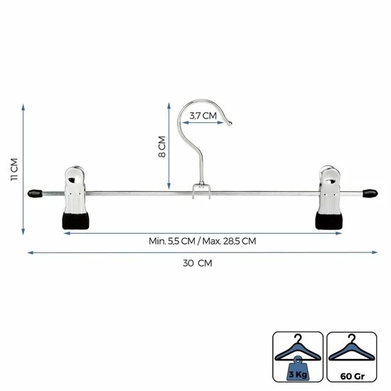 De kledinghangers zijn voorzien van krachtige verstelbare klemmen met een draagkracht van 3 kg. Je kunt de klemmen eenvoudig in de breedte afstellen. Je kunt ze in de breedte plaatsen of smal; tot één centimeter van elkaar verwijderd. Zo kun je de hanger eenvoudig customizen en geschikt maken voor ieder kledingstuk of soort textiel.