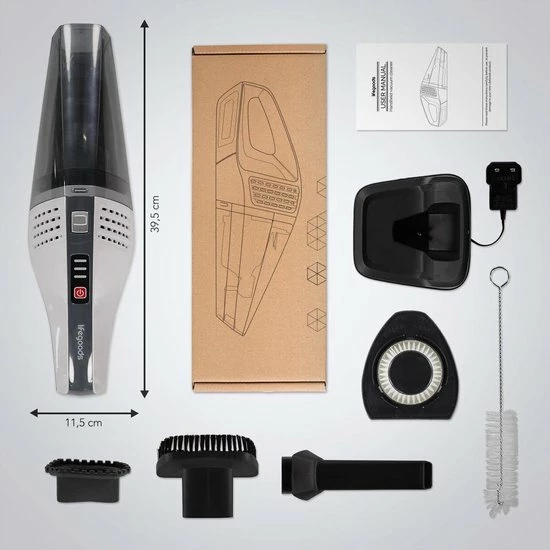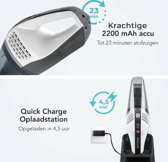 De LifeGoods kruimeldief is uitgerust met een 14,8 V 2200 mAh Li-ion batterij. Met een volle accu kun je tot 23 min aan een stuk stofzuigen. Een lege accu is in ~270 min weer volledig opgeladen.