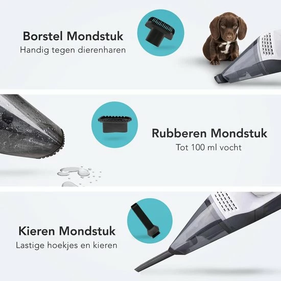 Je kunt de stofzuiger gebruiken voor zowel natte als droge viezigheid. Hiervoor leveren wij ook een uniek rubberen opzetstuk. Dan blijft de vloeistof niet in de borstelharen zitten. Je kunt niet meer dan 100ml aan vloeistof opzuigen.