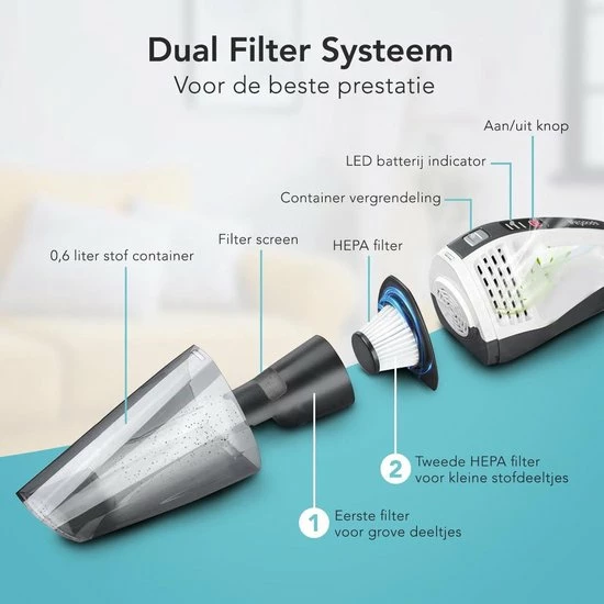 De lucht die uit een stofzuiger komt ruikt soms muf. Onze kruimelzuiger bevat naast het grove filter een extra HEPA filter. Deze vangt 99.9% van de kleine deeltjes op om de verspreiding van bacteriën in de lucht tegen te gaan. Je kunt dit filter handmatig schoonmaken. Omdat jouw gezondheid zeer belangrijk is, leveren wij een gratis tweede HEPA filter.