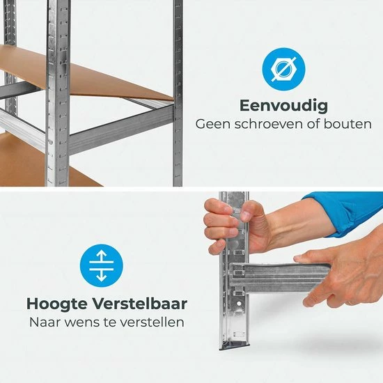 De stellage is gemaakt van stevig verzinkt metaal. Zelfs in een vochtige garage gaat het metaal niet roesten. De houten planken beschermen je spullen tegen krassen en beschadigingen. De stellingkast gaat daardoor lang mee!