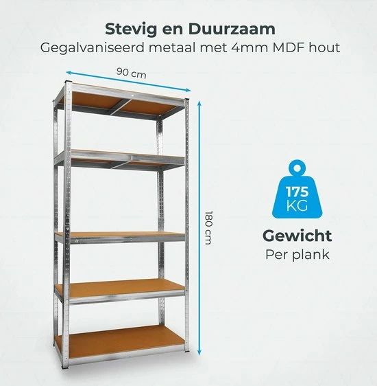 De stellage heeft 5 lange opbergplanken. Iedere plank heeft maar liefst 175 kg draagkracht. In totaal biedt de stellage je ongeveer 1.8 m2 aan opbergruimte. De garage ziet er binnen no-time opgeruimd uit.