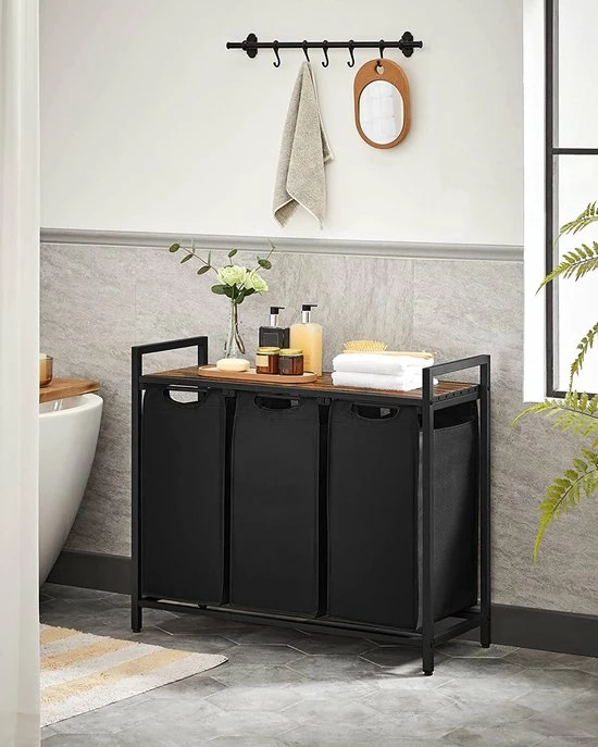 - wasmand, wasverzamelaar, 3 vakken, met legbord, wassorteerbak, waszak uitschuifbaar en uitneembaar, per waszak 38 liter, voor badkamer, wasruimte, vintage bruin-zwart