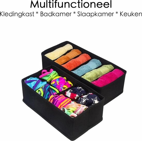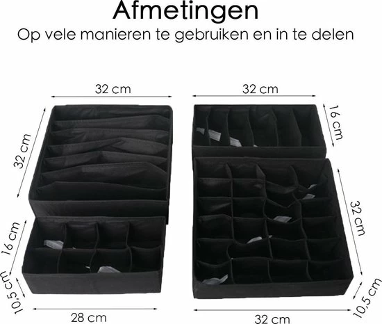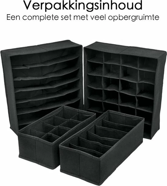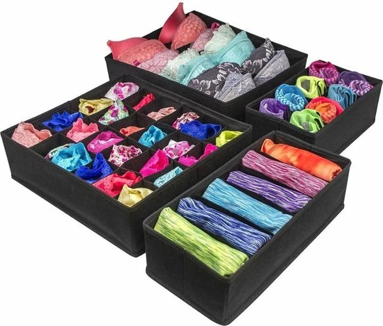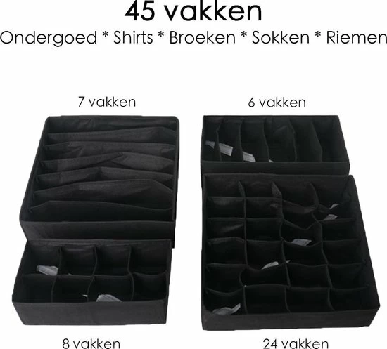 De kledingkast organiser is een praktische oplossing om een einde te maken aan de rommel in je kast. Deze set is ideaal voor het netjes opbergen van al je ondergoed, bh’s, hemden, onderbroeken, sokken, kousen, shirts, korte broeken, leggings, zwembroeken en andere kledingstukken. Het zijn 4 boxen met verschillende afmetingen en vakken gemaakt van kwalitatief hoogwaardig materiaal. Door de ruime hoeveelheid opbergvakken is er ruimte voor 45 stuks kleding. Je kledingkast blijft hierdoor netjes, overzichtelijk en georganiseerd. Dit gaat je veel frustratie en tijd schelen!