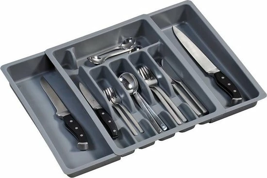 Uitschuifbare bestekbak van Plastic | 6 Vaks -> Uitschuifbaar naar 8 Vaks.Super handig deze uitschuifbare bestekbak van plastic. De basismaat is 29 x 38 x 6,3 cm. Maar hij is uitschuifbaar naar 50 x 38 x 6,3 Cm. Deze besteklade past dus in vrijwel elke keukenla. Product informatie:- Merk: Kesper- Afmeting bestekbak ingeschoven: 29 cm breed x 38 cm diep x 6,3cm hoog (6 vakken)- Afmeting bestekbak uitgeschoven: 50 cm breed x 38 cm diep x 6,3 cm hoog (8 vakken)- Materiaal: Plastic- Kleur: GRIJS- Degelijke kwaliteit en lichtgewicht- CE goedgekeurd