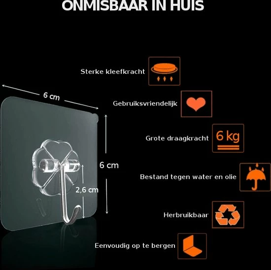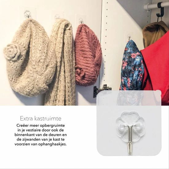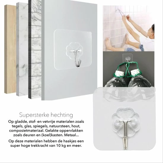 Met deze waterbestendige, supersterke zelfklevende ophanghaakjes, krijgen je spullen in de badkamer, keuken en berging in no-time en zonder stof of lawaai te maken, een eigen, makkelijk te bereiken plek.