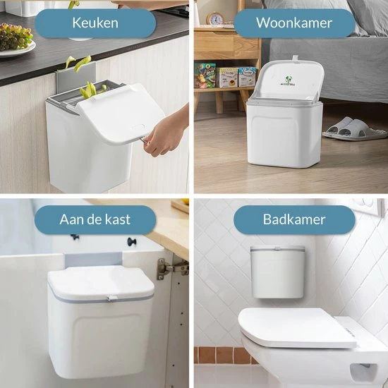De prullenbak is eenvoudig hangend te installeren met de meegeleverde montageaccessoire (1 haak en 1 plakbord). Klein en perfect passend voor de meeste kastdeuren. Voor het ophangen met de haak mag de deur niet dikker als 2,5cm zijn. Onze prullenbak heeft niet alleen het perfecte formaat voor het aanrecht in de keuken, maar past ook onder de gootsteen.