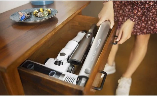 Het compacte formaat is geschikt voor elke woning. Bevestig de stofzuiger aan de muur of zet hem rechtop in de hoek voor snelle toegang — of haal hem uit elkaar en berg hem op waar je wilt, zelfs in een lade.