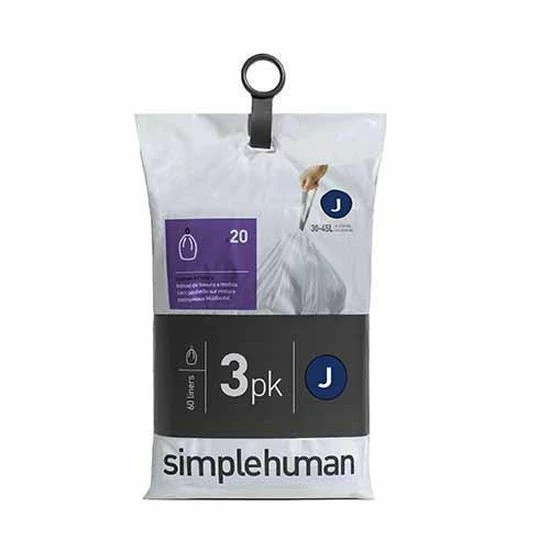 Afvalzakken voor Liner Pocket afvalemmers van Simplehuman. Code J / 30 – 45 liter / Set van 3×20 stuks. Alle afvalzakken opgeborgen in de afvalemmer en altijd bij de hand wanneer de volle afvalzak gewisseld dient te worden. Deze afvalzakken uit de Liner Pocket serie met code J zijn geschikt zijn voor alle soorten afvalemmers met een inhoud van circa 30 – 45 liter. De afvalzakken passen ook in kleinere prullenbakken.
