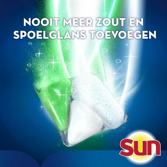 Bij het gebruik van classic tabletten moet je nog zout en spoelglans toevoegen. Dit is nu niet meer nodig, want deze ingrediënten zitten al in Sun All-in 1 vaatwascapsules. Het toegevoegde zout heeft een antikalk-effect. Het verzacht het water gedurende het proces zodat er geen kalkaanslag op het glaswerk ontstaat. De spoelglans zorgt voor een streeploos resultaat. Een vaatwascapsule is voldoende om je vaat heerlijk fris te laten ruiken.