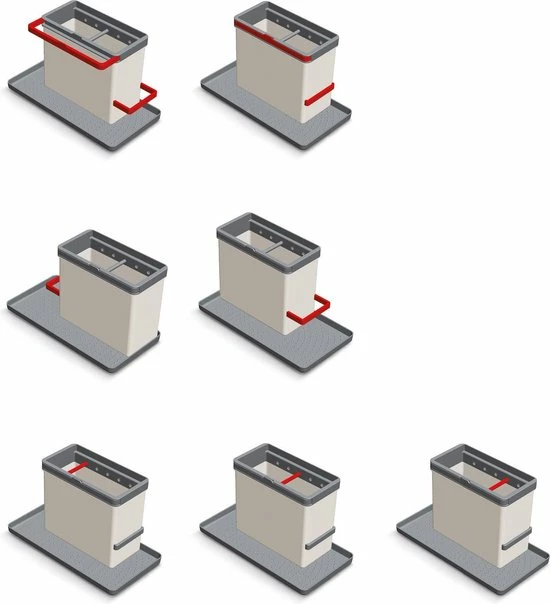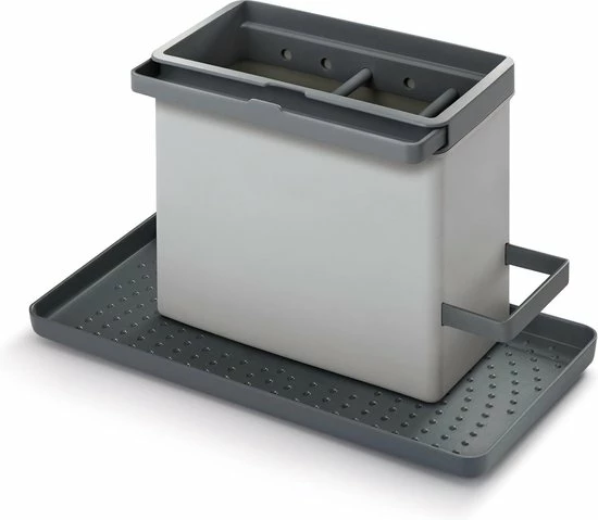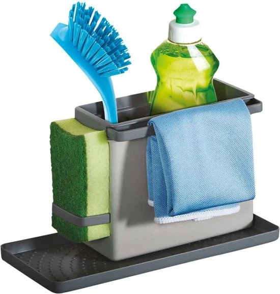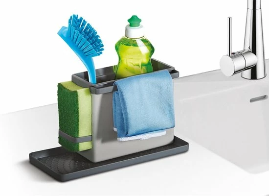 Dit rek biedt ruimte voor het bewaren van je afwasmiddel en afwasborstel. Het heeft twee verlengbare rails om vochtige doekjes en sponzen op te hangen. De organiser is modulair en kan op verschillende manieren worden gemonteerd zodat hij overal past.