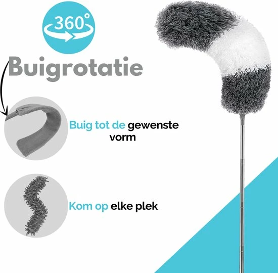 Maak het jezelf gemakkelijk. Stof is verleden tijd met deze geavanceerde plumeau. Bereik zorgeloos zelfs de meest moeilijkste plekken in huis via de lange uitschuifbare steel en de 360° buig rotatie. Was de stoffers eenvoudig met warm water en herbruik wanneer nodig.