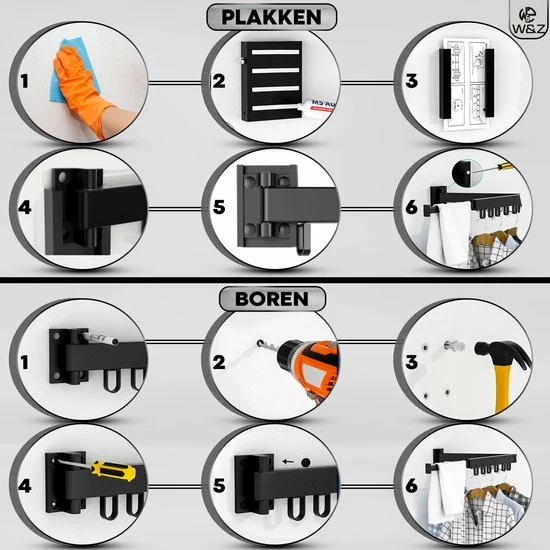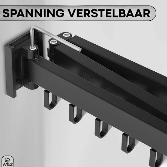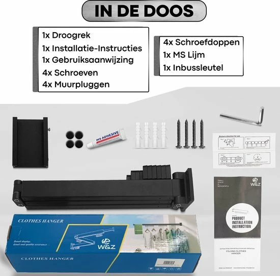 Het droogrek is eenvoudig te bevestigen met de bijgeleverde onderdelen en schroeven. Wil je liever niet boren in de muur? Dan kun je met de speciale lijn binnen enkele seconden en zonder gereedschap bevestigen. Maar zorg ervoor dat je het installeert volgens de installatiehandleiding als u geen gaten wilt boren.