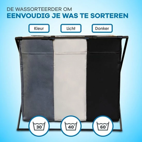 Sta jij ook vaak bergen was te sorteren op jouw wasdag? Dat kan makkelijker! Dankzij de Witts wasmand met 3 vakken kun je de vuile was meteen op kleur sorteren, dat bespaart een heleboel tijd en gedoe. De wasmand heeft een stijlvol zwart frame, is opvouwbaar en heeft een grote inhoud van 90 liter. Ontdek snel het gemak van de handige wassorteerder van Witts.